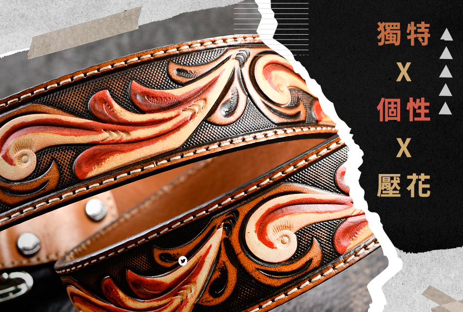 運用印地安元素、復古刻花、個性鉚釘、真皮皮革、馬毛..等來完成每一款真皮皮帶的設計,
