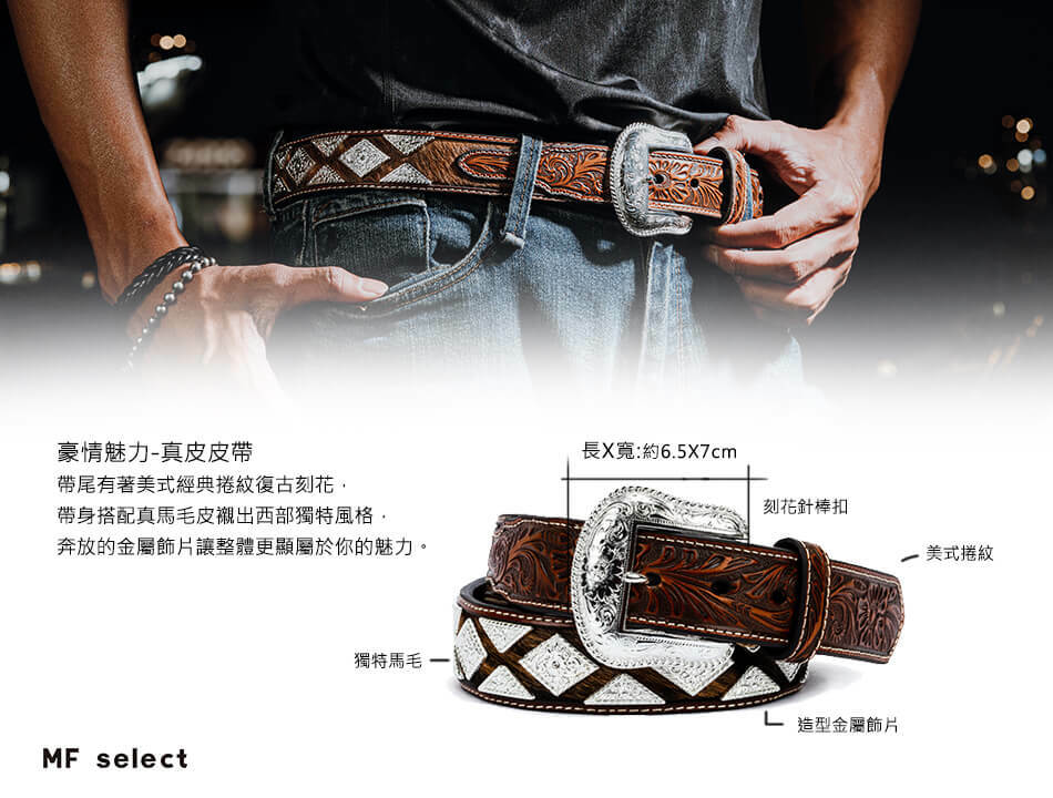 源自於美國西部牛仔的設計靈感,運用印地安元素、復古刻花、個性鉚釘、真皮皮革、馬毛..等來完成每一款真皮皮帶的設計,讓每一款真皮皮帶都能蘊含西部牛仔的率性與狂野,讓配戴者穿戴出自我率性。