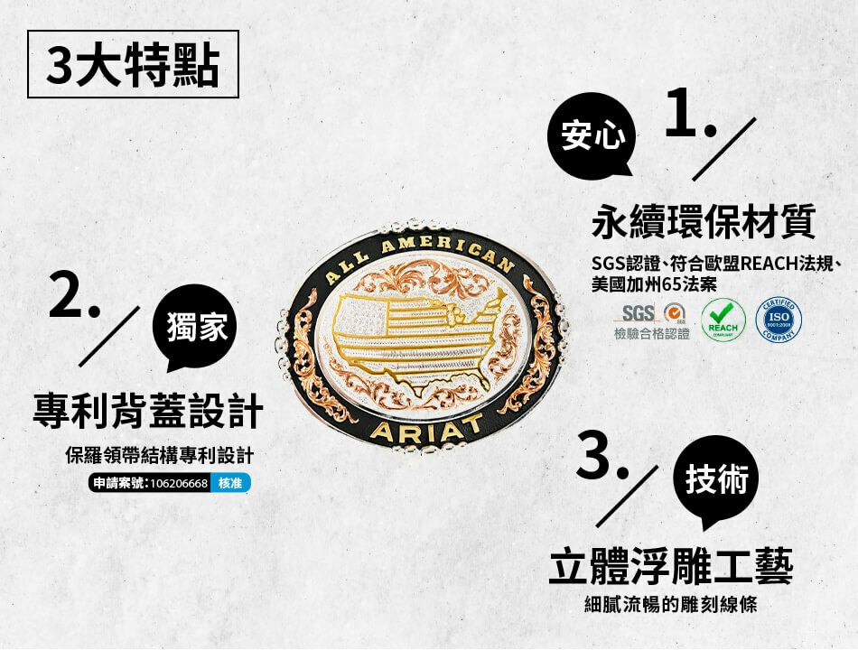 商品項目:保羅領帶(Bolo tie)、項鍊、手鍊、快拆皮帶、造型手工帶扣、潮流帽等率性飾品,商品皆使用環保材質,符合美國加州65法案及歐盟REACH法規。