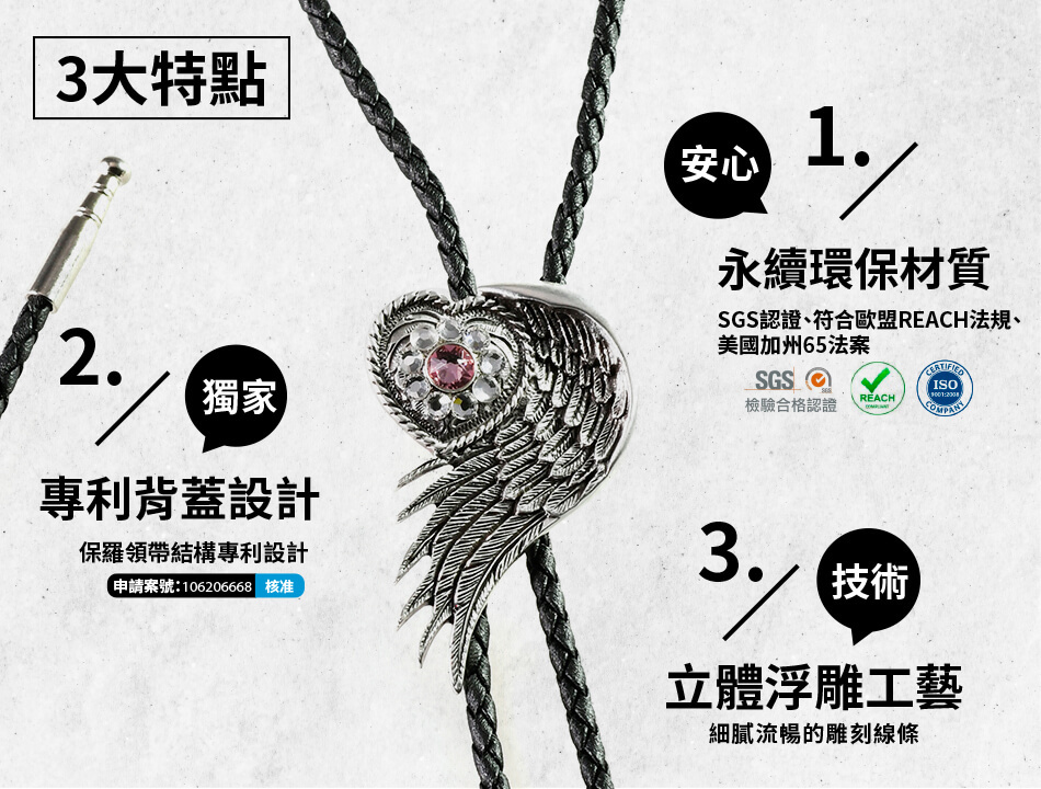 商品項目:保羅領帶(Bolo tie)、項鍊、手鍊、快拆皮帶、造型手工帶扣、潮流帽等率性飾品,商品皆使用環保材質,符合美國加州65法案及歐盟REACH法規。