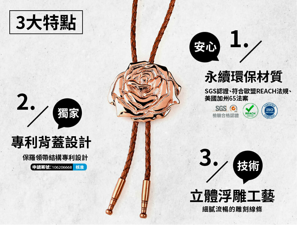商品項目:保羅領帶(Bolo tie)、項鍊、手鍊、快拆皮帶、造型手工帶扣、潮流帽等率性飾品,商品皆使用環保材質,符合美國加州65法案及歐盟REACH法規。