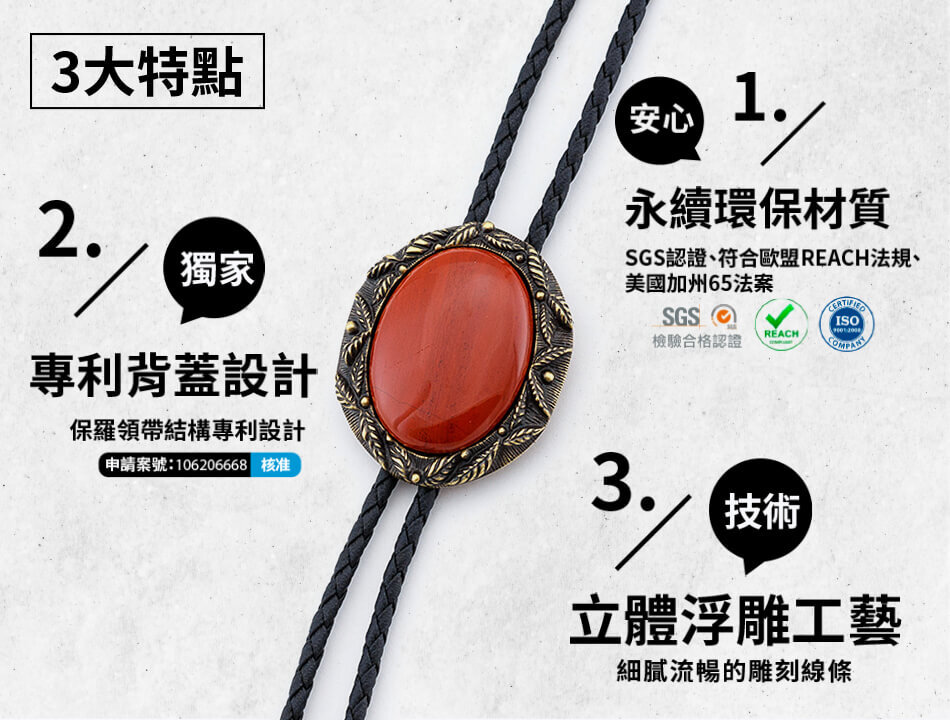 商品項目:保羅領帶(Bolo tie)、項鍊、手鍊、快拆皮帶、造型手工帶扣、潮流帽等率性飾品,商品皆使用環保材質,符合美國加州65法案及歐盟REACH法規。