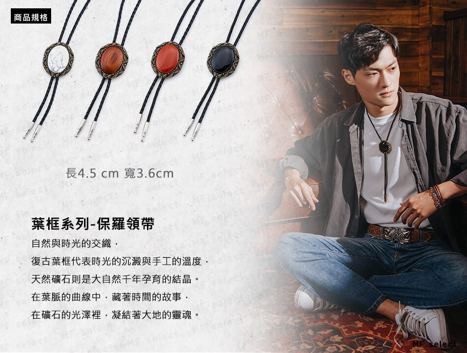 MF select保羅領帶(Bolo tie)專家,源於美式自由率性精神,打造強烈風格穿搭飾品,以硬派、都會休閒、復古紳士三種風格詮釋狂野、帥氣、經典等品味引領潮流。