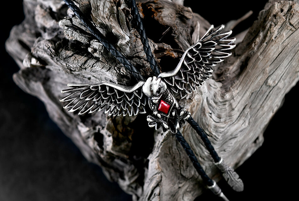 飛鷹翱翔、簍空雕刻、紅珊瑚亮眼色澤點綴,融合古銀染黑作舊工藝。