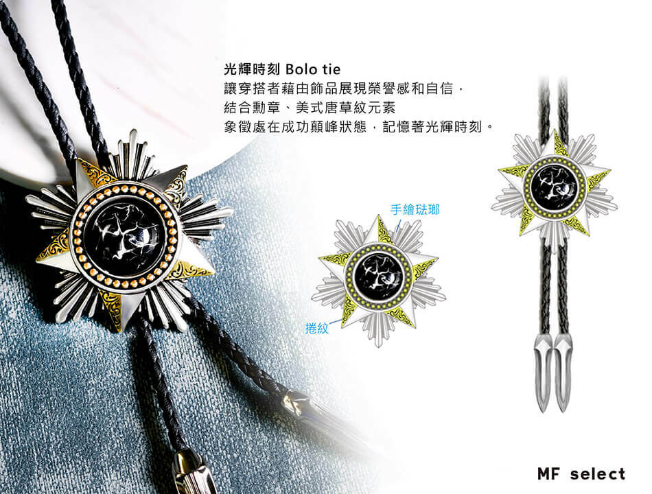 MF select保羅領帶(Bolo tie)專家,源於美式自由率性精神,打造強烈風格穿搭飾品,以硬派、都會休閒、復古紳士三種風格詮釋狂野、帥氣、經典等品味引領潮流。