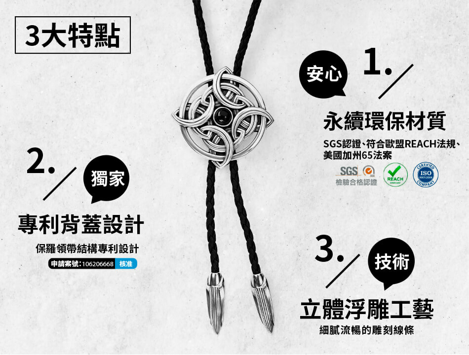 商品項目:保羅領帶(Bolo tie)、項鍊、手鍊、快拆皮帶、造型手工帶扣、潮流帽等率性飾品,商品皆使用環保材質,符合美國加州65法案及歐盟REACH法規。
