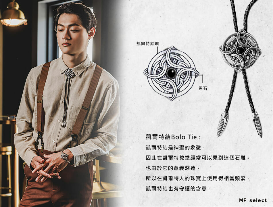 MF select保羅領帶(Bolo tie)專家,源於美式自由率性精神,打造強烈風格穿搭飾品,以硬派、都會休閒、復古紳士三種風格詮釋狂野、帥氣、經典等品味引領潮流。