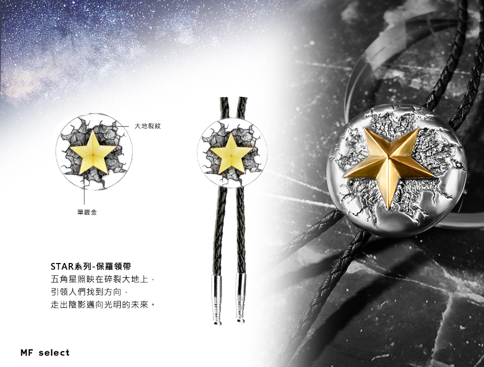 MF select保羅領帶(Bolo tie)專家,源於美式自由率性精神,打造強烈風格穿搭飾品,以硬派、都會休閒、復古紳士三種風格詮釋狂野、帥氣、經典等品味引領潮流。