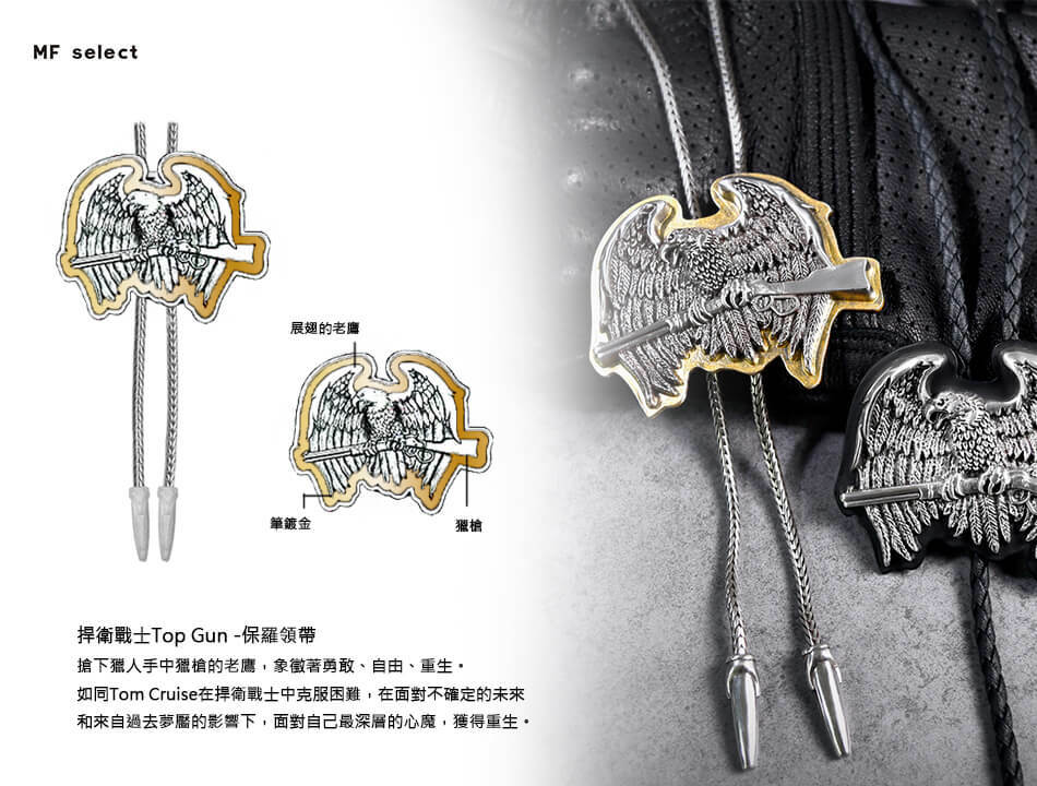 MF select保羅領帶(Bolo tie)專家,源於美式自由率性精神,打造強烈風格穿搭飾品,以硬派、都會休閒、復古紳士三種風格詮釋狂野、帥氣、經典等品味引領潮流。