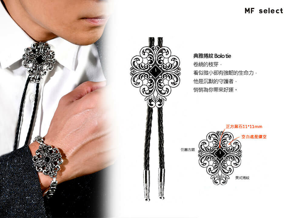 MF select保羅領帶(Bolo tie)專家,源於美式自由率性精神,打造強烈風格穿搭飾品,以硬派、都會休閒、復古紳士三種風格詮釋狂野、帥氣、經典等品味引領潮流。