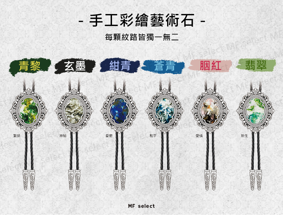 MF select保羅領帶(Bolo tie)專家,源於美式自由率性精神,打造強烈風格穿搭飾品,以硬派、都會休閒、復古紳士三種風格詮釋狂野、帥氣、經典等品味引領潮流。