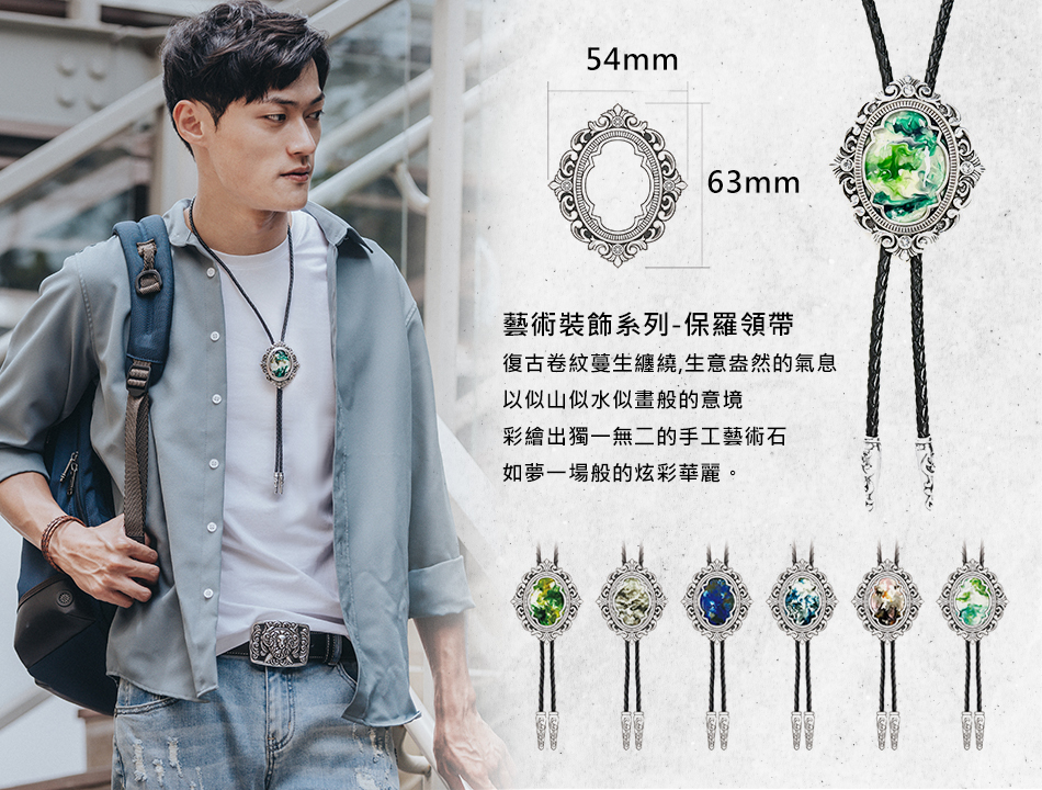 商品項目:保羅領帶(Bolo tie)、項鍊、手鍊、快拆皮帶、造型手工帶扣、潮流帽等率性飾品,商品皆使用環保材質,符合美國加州65法案及歐盟REACH法規。