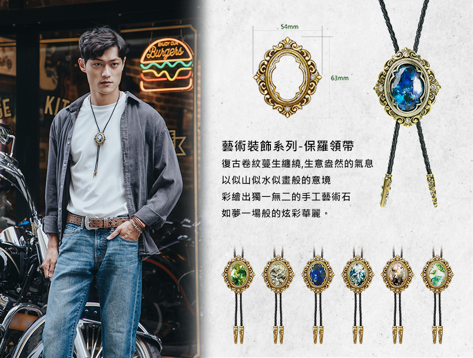 商品項目:保羅領帶(Bolo tie)、項鍊、手鍊、快拆皮帶、造型手工帶扣、潮流帽等率性飾品,商品皆使用環保材質,符合美國加州65法案及歐盟REACH法規。