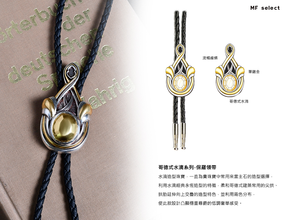 MF select保羅領帶(Bolo tie)專家,源於美式自由率性精神,打造強烈風格穿搭飾品,以硬派、都會休閒、復古紳士三種風格詮釋狂野、帥氣、經典等品味引領潮流。
