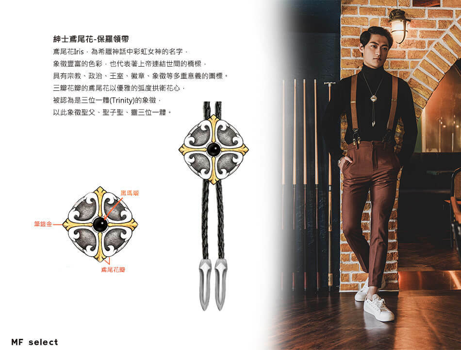 MF select保羅領帶(Bolo tie)專家,源於美式自由率性精神,打造強烈風格穿搭飾品,以硬派、都會休閒、復古紳士三種風格詮釋狂野、帥氣、經典等品味引領潮流。