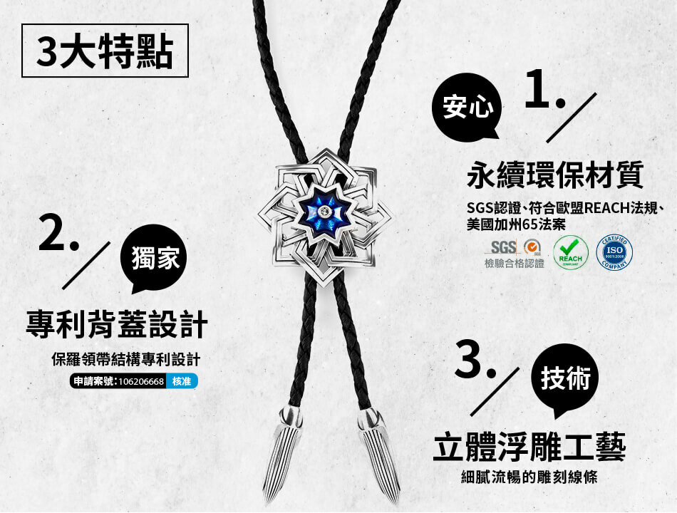 商品項目:保羅領帶(Bolo tie)、項鍊、手鍊、快拆皮帶、造型手工帶扣、潮流帽等率性飾品,商品皆使用環保材質,符合美國加州65法案及歐盟REACH法規。