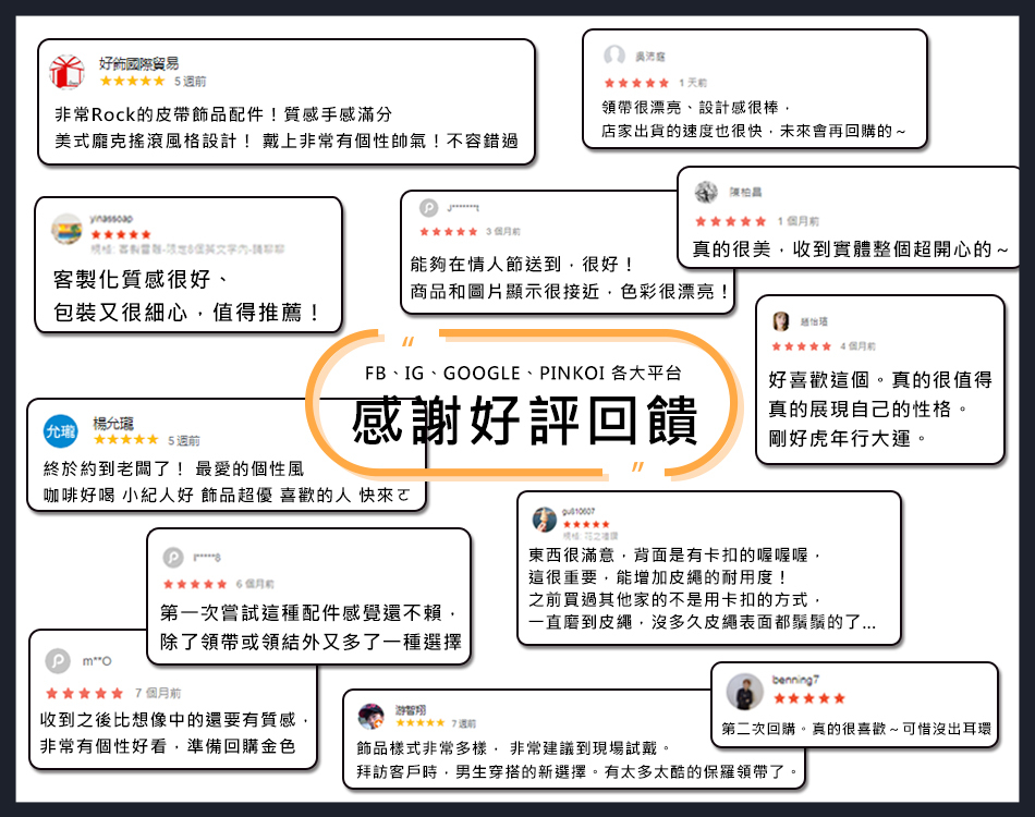 商品項目:保羅領帶(Bolo tie)、項鍊、手鍊、快拆皮帶、造型手工帶扣、潮流帽等率性飾品,商品皆使用環保材質,符合美國加州65法案及歐盟REACH法規。