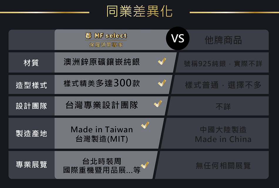 MF select為亞邦創意(股)公司旗下品牌,擁有從開發、設計、量產製造、品質管控、品牌行銷、售後服務等完整一條龍MIT精品公司,所有飾品除金工設計師自行開發外,也與來自歐美跨國設計師合作開發。