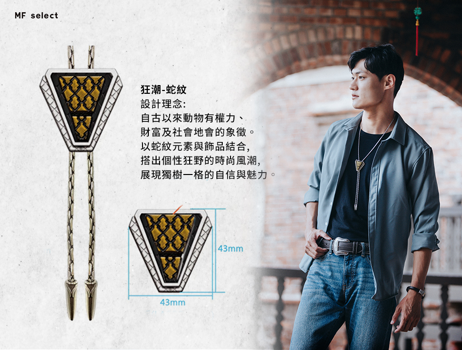 MF select保羅領帶(Bolo tie)專家,源於美式自由率性精神,打造強烈風格穿搭飾品,以硬派、都會休閒、復古紳士三種風格詮釋狂野、帥氣、經典等品味引領潮流。