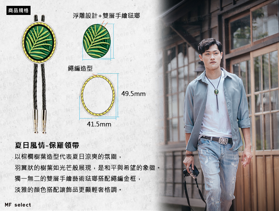 MF select保羅領帶(Bolo tie)專家,源於美式自由率性精神,打造強烈風格穿搭飾品,以硬派、都會休閒、復古紳士三種風格詮釋狂野、帥氣、經典等品味引領潮流。