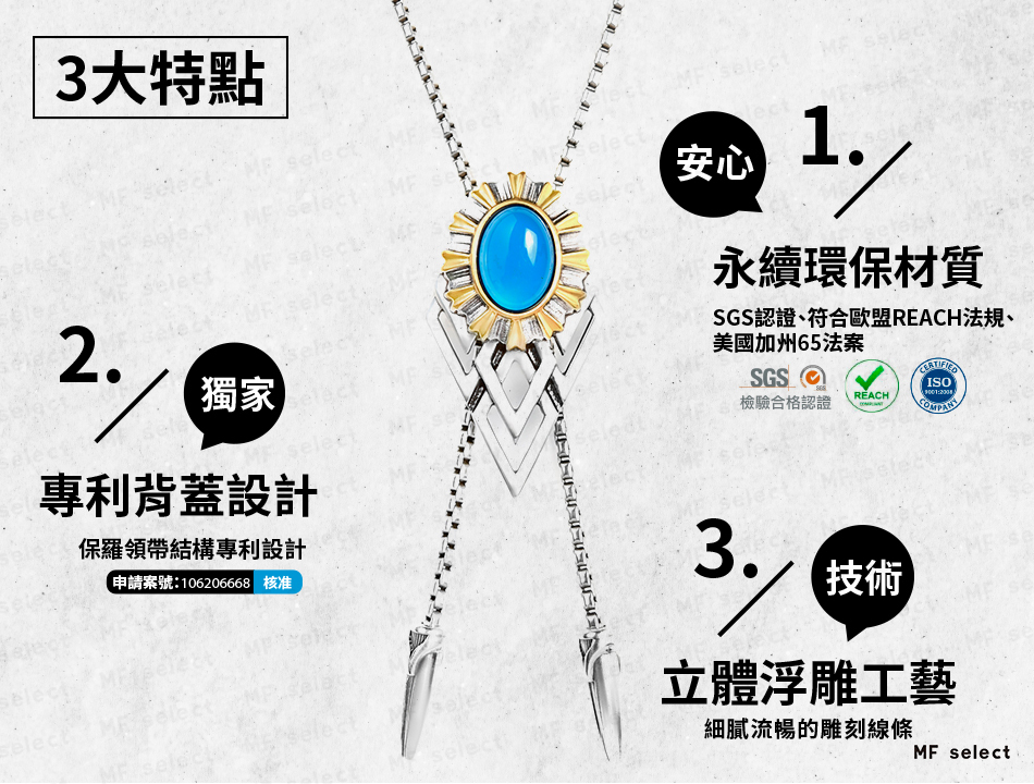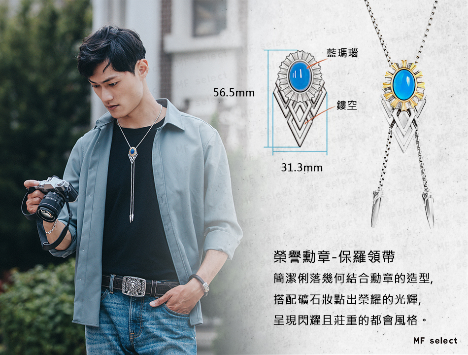 MF select保羅領帶(Bolo tie)專家,源於美式自由率性精神,打造強烈風格穿搭飾品,以硬派、都會休閒、復古紳士三種風格詮釋狂野、帥氣、經典等品味引領潮流。