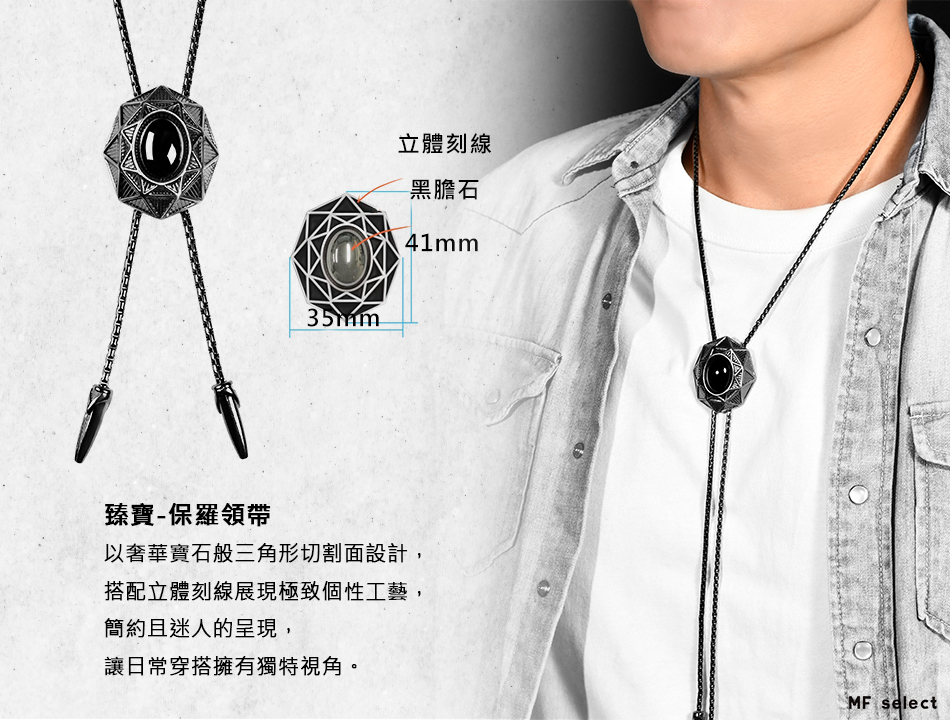 MF select保羅領帶(Bolo tie)專家,源於美式自由率性精神,打造強烈風格穿搭飾品,以硬派、都會休閒、復古紳士三種風格詮釋狂野、帥氣、經典等品味引領潮流。