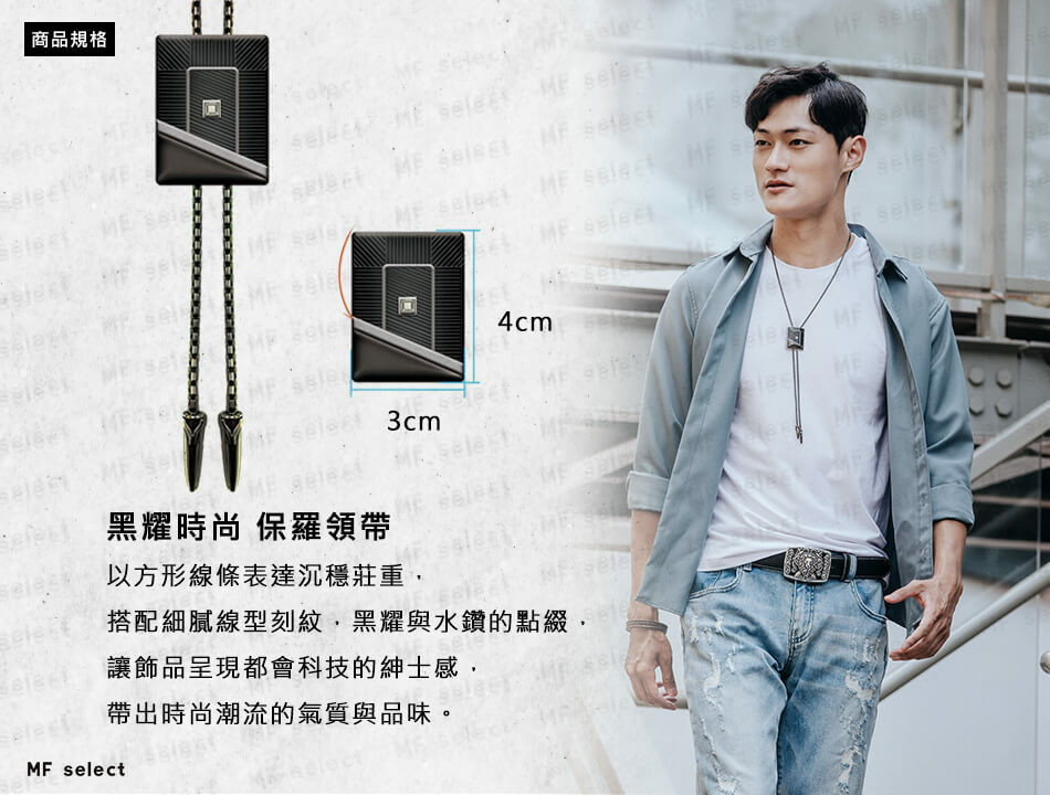 MF select保羅領帶(Bolo tie)專家,源於美式自由率性精神,打造強烈風格穿搭飾品,以硬派、都會休閒、復古紳士三種風格詮釋狂野、帥氣、經典等品味引領潮流。