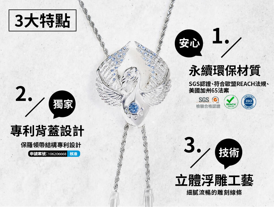 商品項目:保羅領帶(Bolo tie)、項鍊、手鍊、快拆皮帶、造型手工帶扣、潮流帽等率性飾品,商品皆使用環保材質,符合美國加州65法案及歐盟REACH法規。