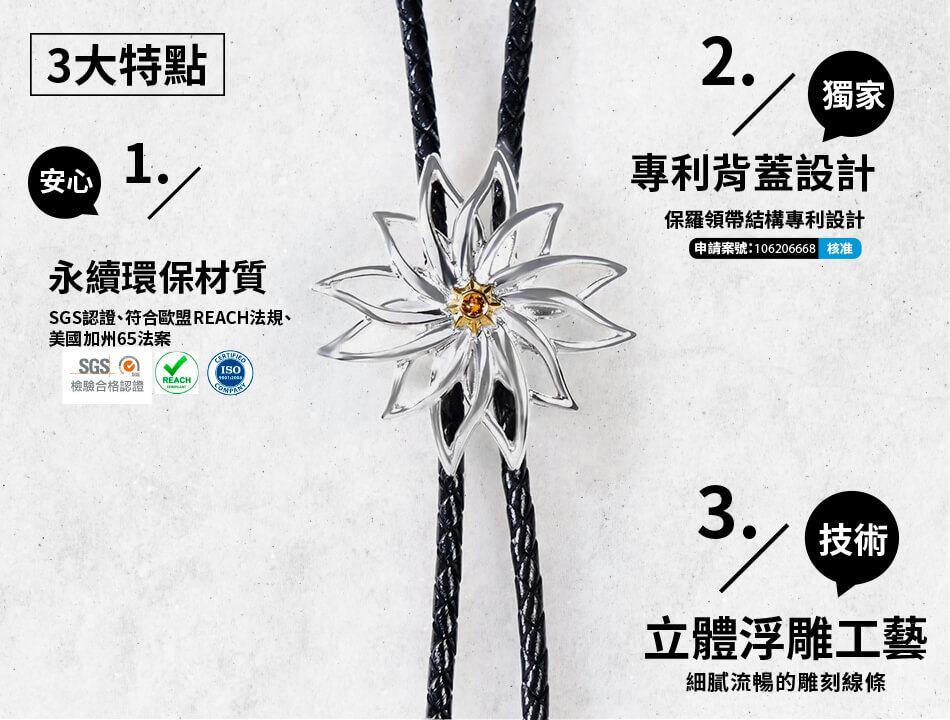 商品項目:保羅領帶(Bolo tie)、項鍊、手鍊、快拆皮帶、造型手工帶扣、潮流帽等率性飾品,商品皆使用環保材質,符合美國加州65法案及歐盟REACH法規。