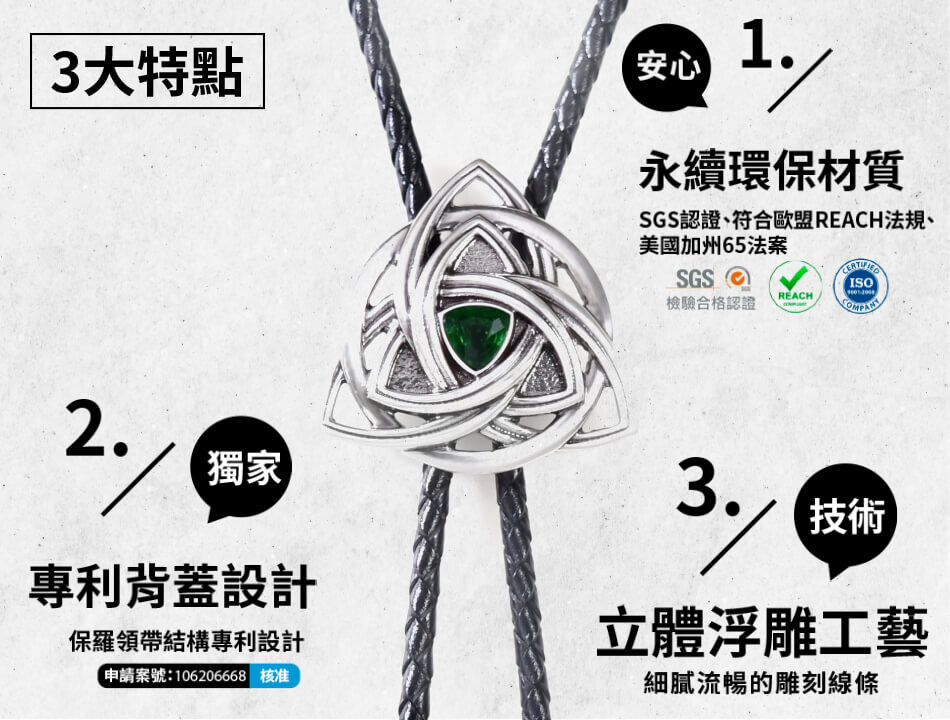 商品項目:保羅領帶(Bolo tie)、項鍊、手鍊、快拆皮帶、造型手工帶扣、潮流帽等率性飾品,商品皆使用環保材質,符合美國加州65法案及歐盟REACH法規。