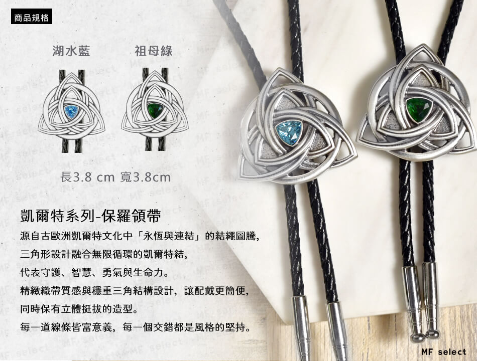 MF select保羅領帶(Bolo tie)專家,源於美式自由率性精神,打造強烈風格穿搭飾品,以硬派、都會休閒、復古紳士三種風格詮釋狂野、帥氣、經典等品味引領潮流。