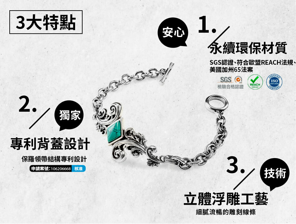 商品項目:保羅領帶(Bolo tie)、項鍊、手鍊、快拆皮帶、造型手工帶扣、潮流帽等率性飾品,商品皆使用環保材質,符合美國加州65法案及歐盟REACH法規。