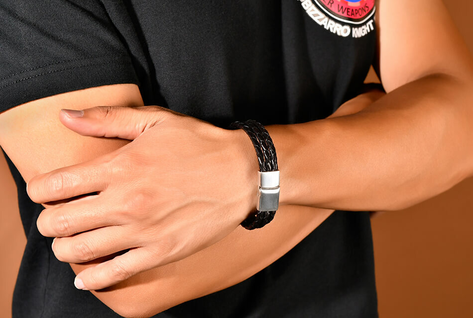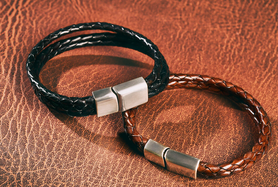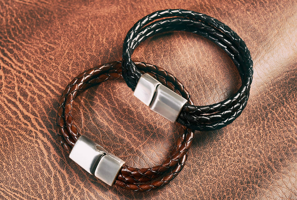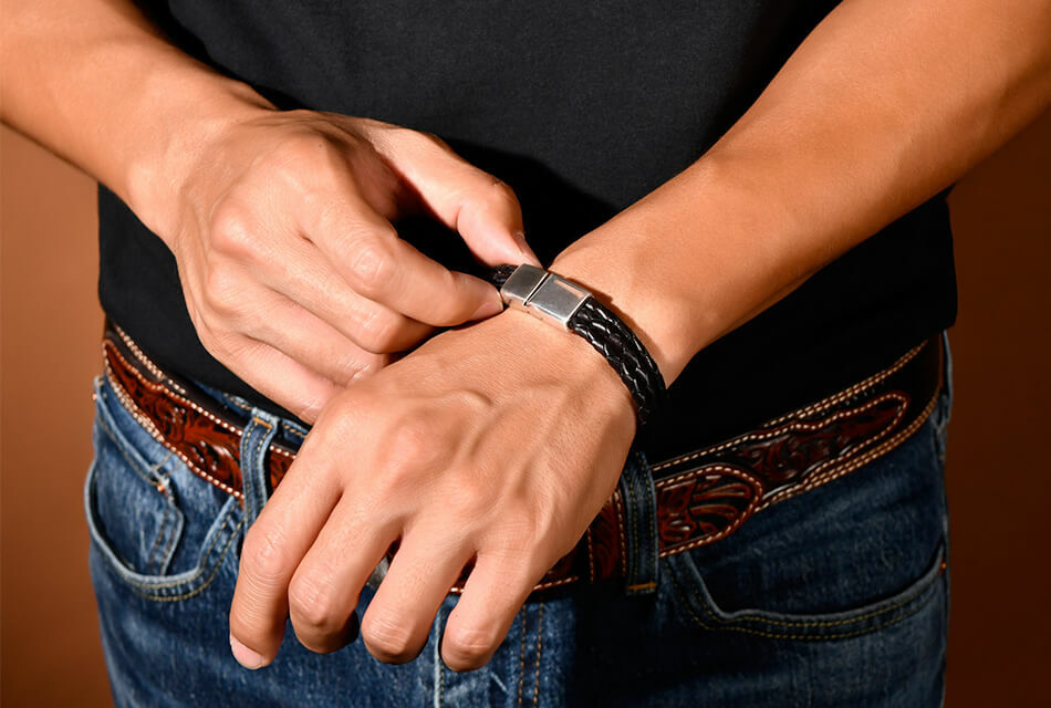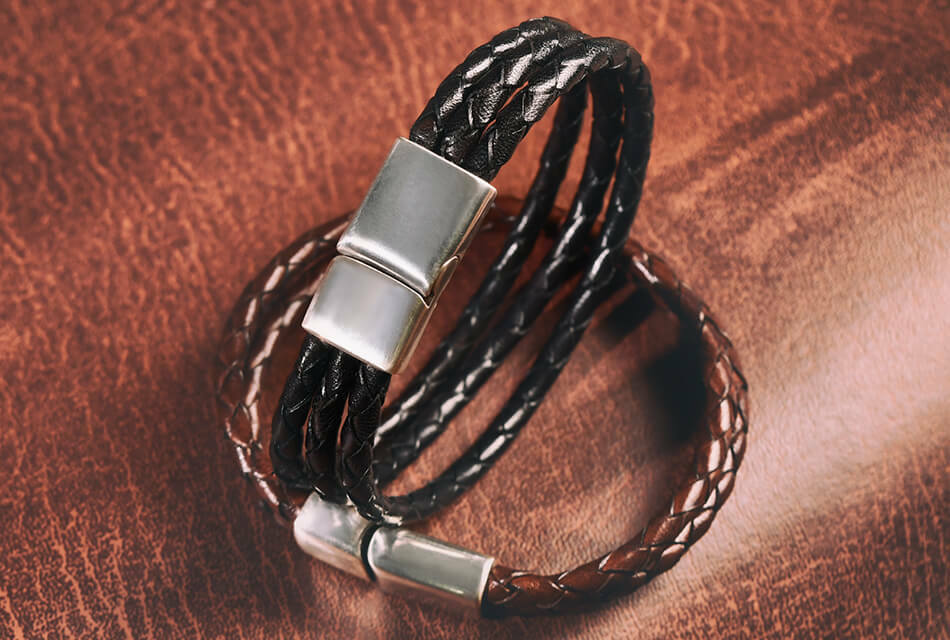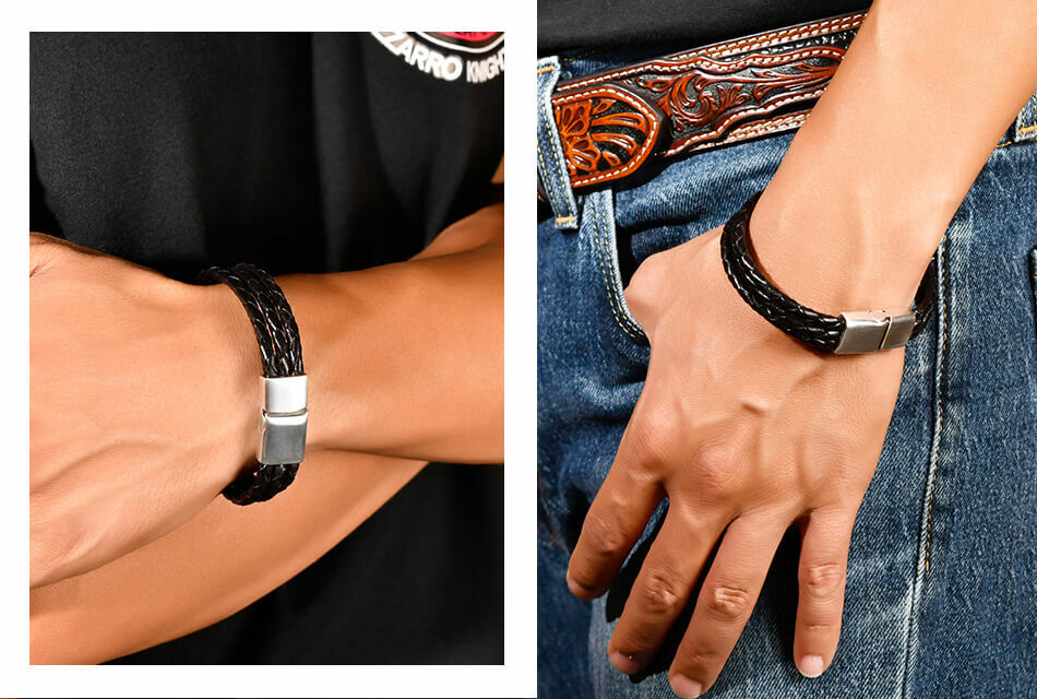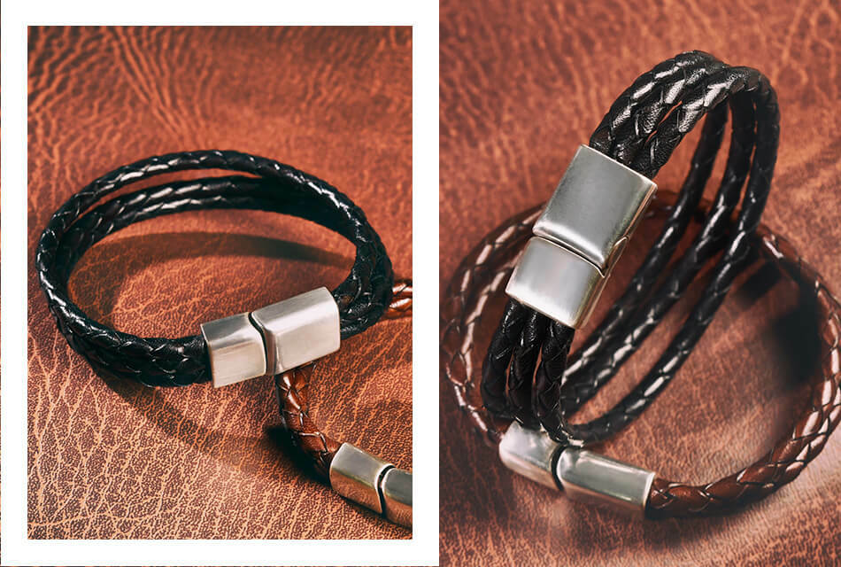 高級牛皮皮革製成的皮革手環,堅固耐用。手工編織,做舊金屬飾環設計,磁扣穿戴。