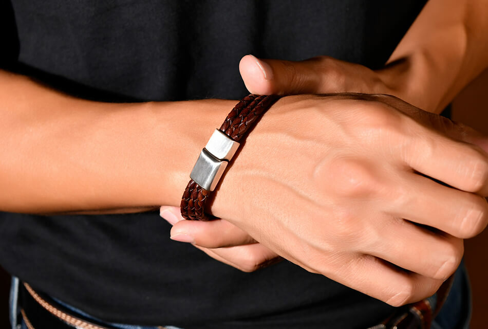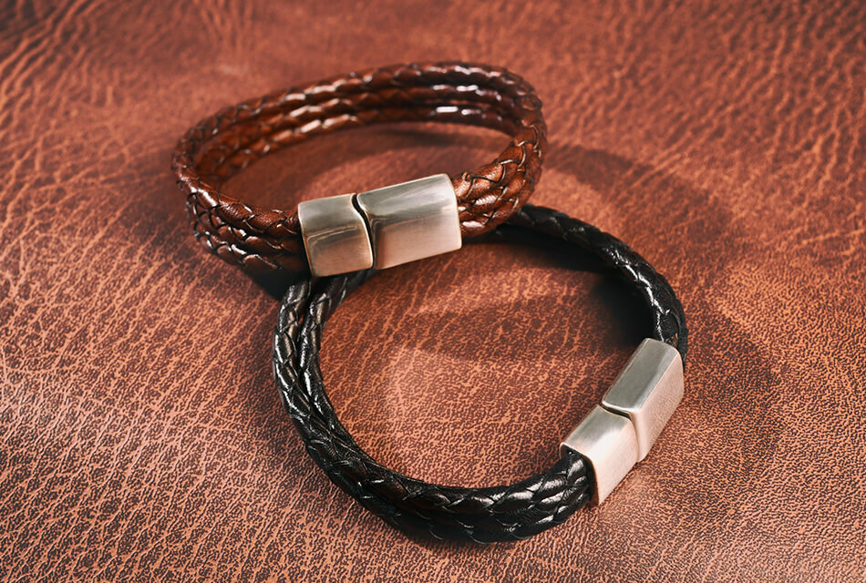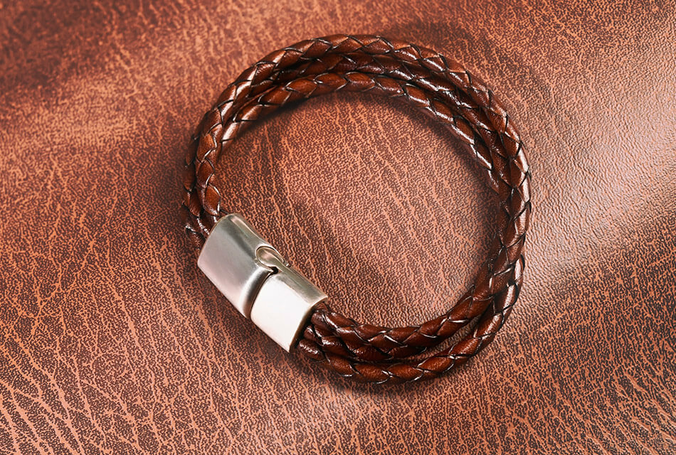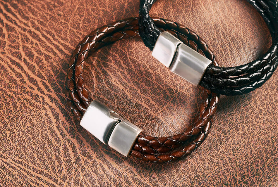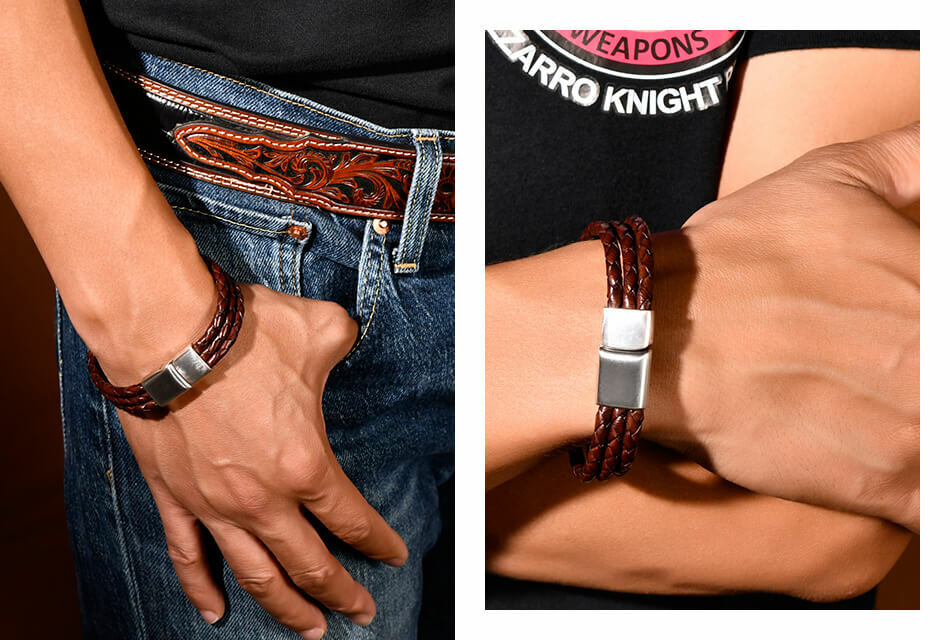 高級牛皮皮革製成的皮革手環,堅固耐用。手工編織,做舊金屬飾環設計,磁扣穿戴。
