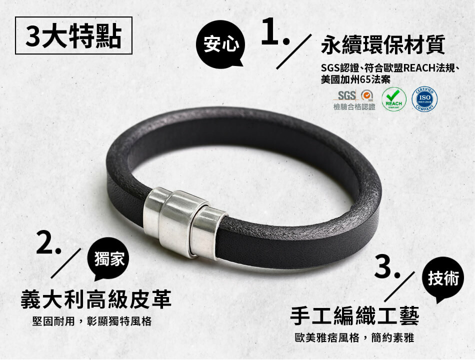 高級牛皮皮革製成的皮革手環,堅固耐用。手工編織,磁扣穿戴設計。