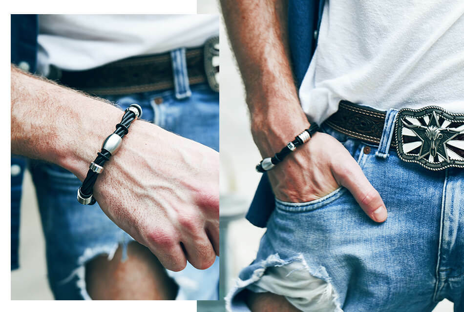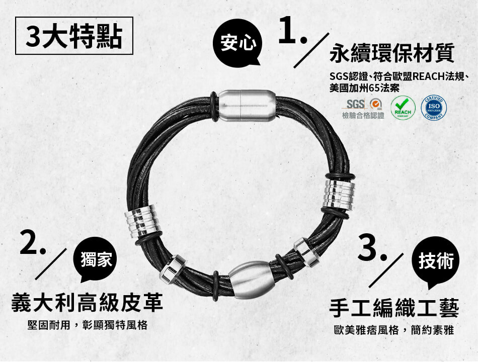 高級牛皮皮革製成的皮革手環,堅固耐用。手工編織,做舊金屬飾環設計,磁扣穿戴。