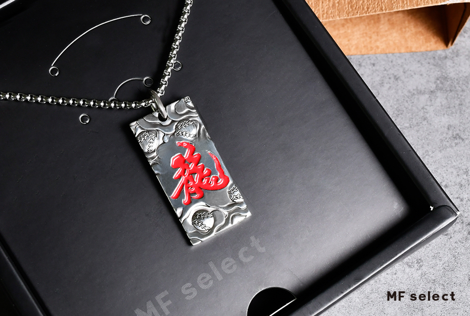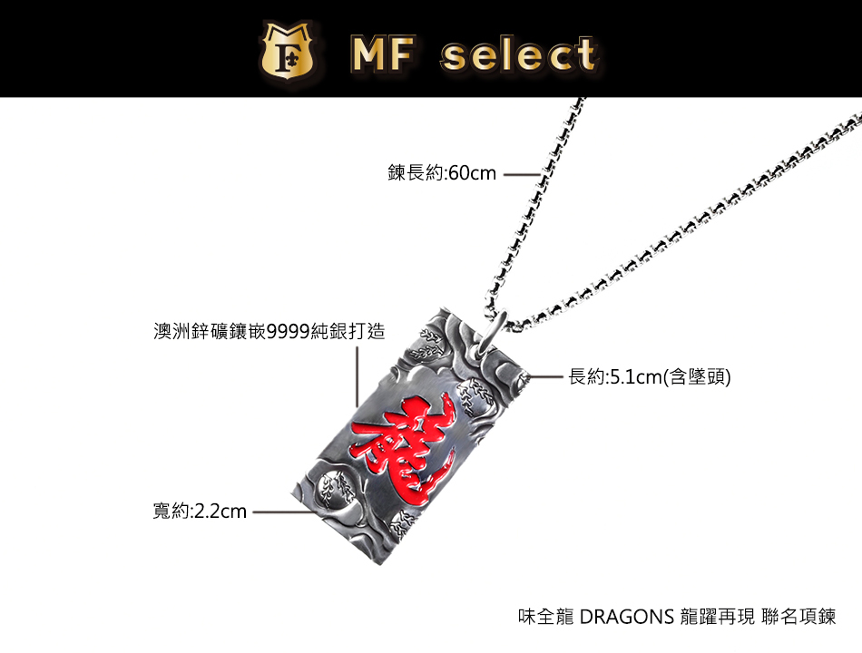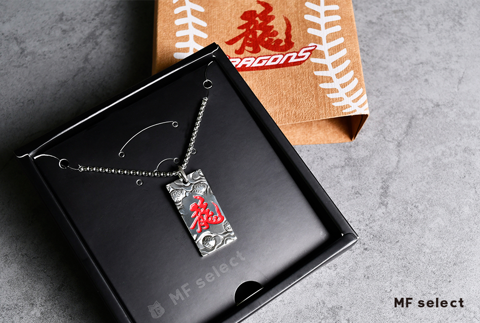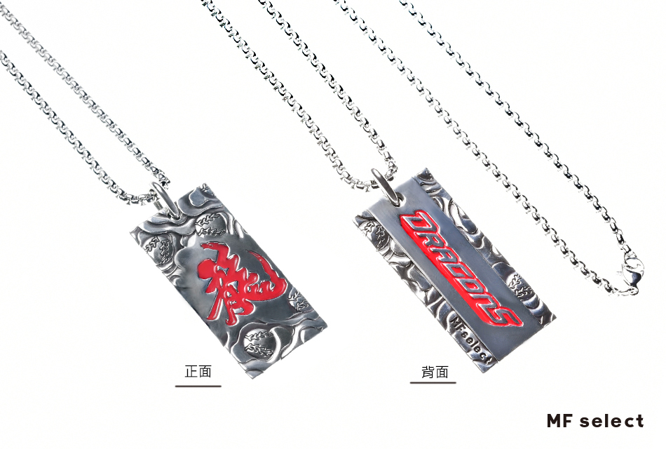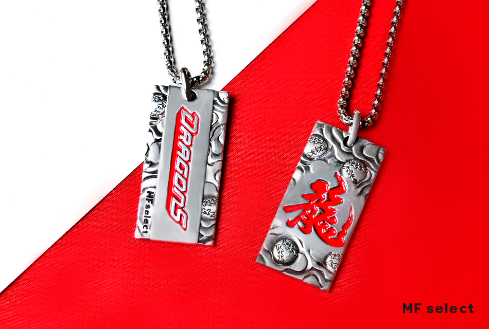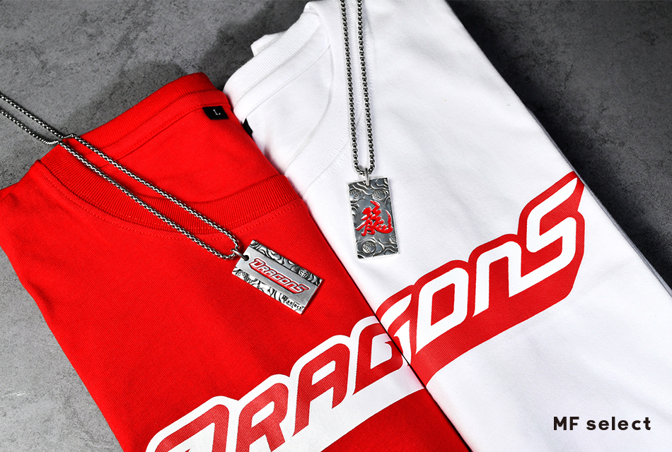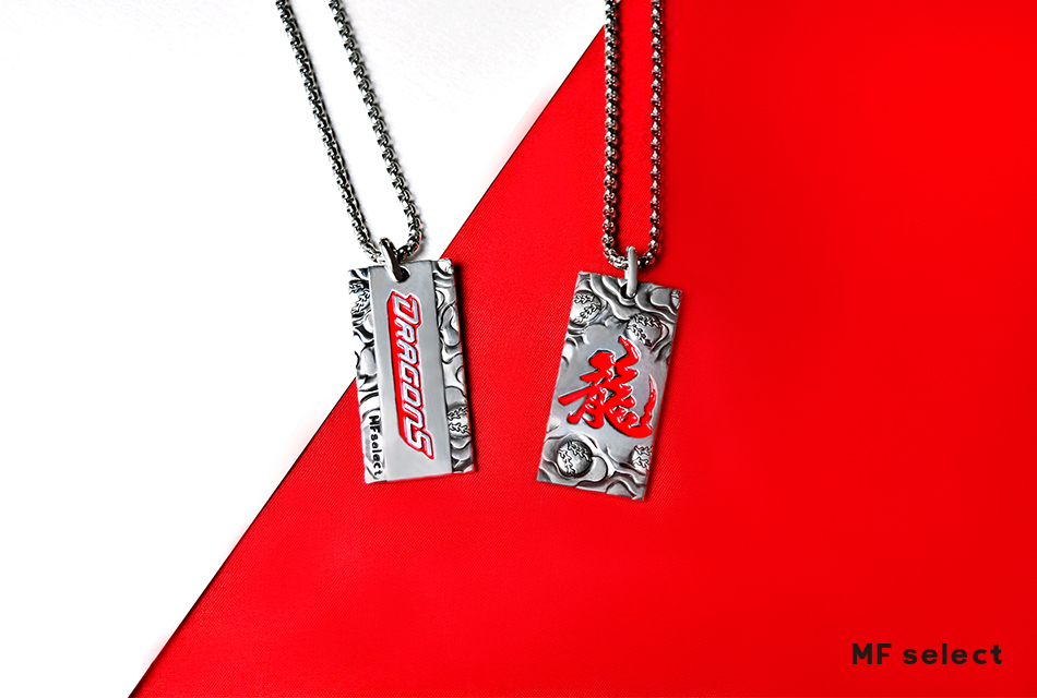 中華職棒球隊-味全龍DRAGONS與MFselect聯名開發款,設計元素以味全龍新視覺龍字為主軸,飾品正面中文「龍」字為主體,透過書法傳遞文化底蘊,背面「DRAGONS」英文字充滿前進衝刺力道接軌國際,整體搭配棒球雲紋圖騰,展現味全龍隊飛向天際的能量和霸氣。