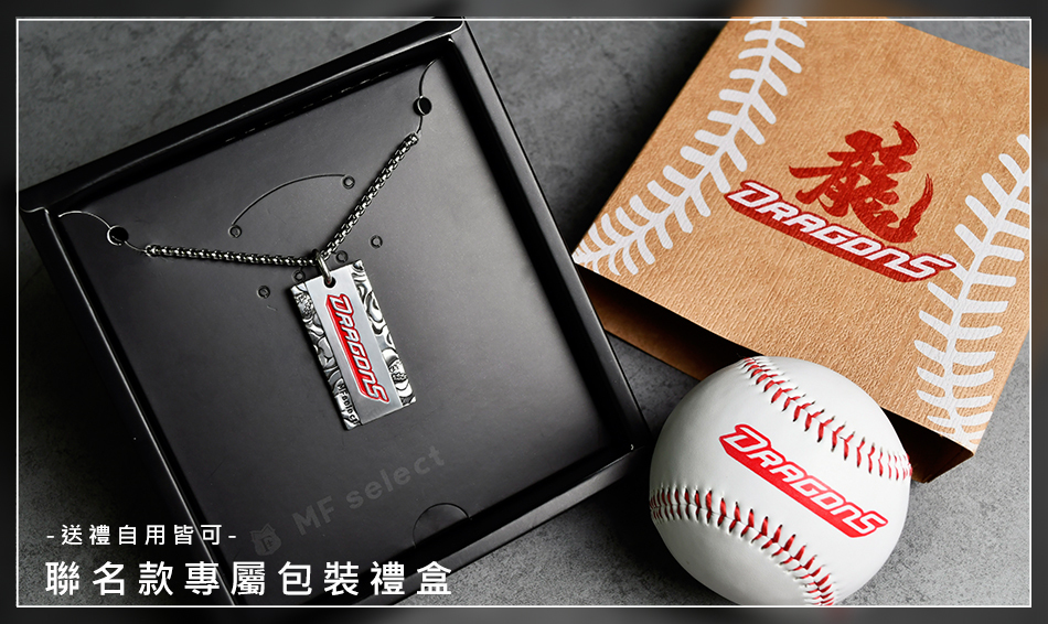 味全龍聯名商品推薦:中華職棒球隊-味全龍DRAGONS與MFselect聯名開發款,設計元素以味全龍新視覺龍字為主軸,飾品正面中文「龍」字為主體,透過書法傳遞文化底蘊,背面「DRAGONS」英文字充滿前進衝刺力道接軌國際,整體搭配棒球雲紋圖騰,展現味全龍隊飛向天際的能量和霸氣。